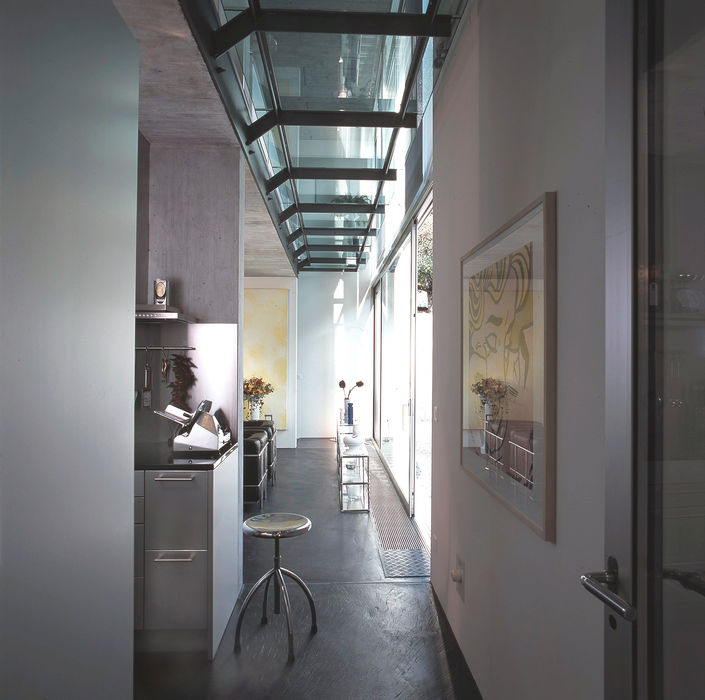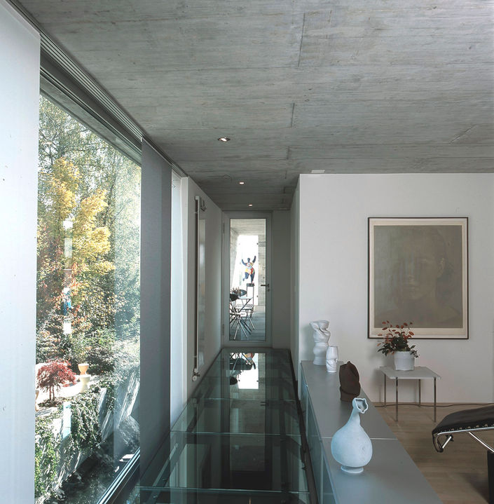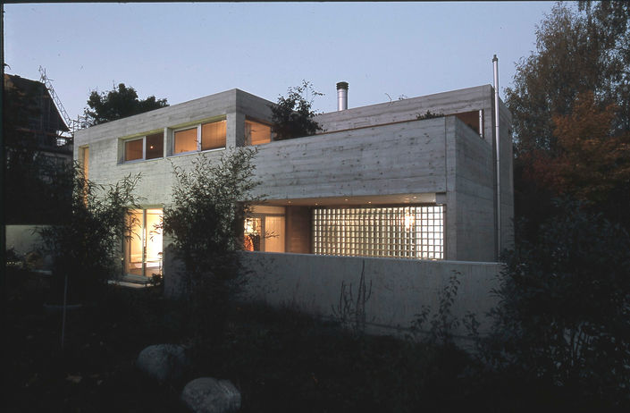 Die gestellte Aufgabe war sehr reizvoll und nicht minder komplex: Im Park einer Villa im Villettenquartier wurde für ein Ehepaar auf engstem Raum ein Wohnhaus erstellt, welches durch einfache kubische Formen und naturbelassene Materialien als Objekt in die Umgebung eingefügt wurde. Das Untergeschoss bietet als Ausstellungsraum der privaten Kunstsammlung einen würdigen Ort. Die bescheidenen Platzverhältnisse ermöglichen einen Wohnkubus von 7 mal 10 Metern, welcher an der Südostseite durch eine direkt angeschlossene grosse Terrasse über dem Eingangsbereich erweitert wird. So entstanden zwei übereinanderliegende Wohnzonen, welche durch eine lichtdurchflutete Glastreppe verbunden sind. Eine haushohe Öffnung auf der Nordseite ermöglicht die Aussicht in einen naturbelassenen Garten. Das Untergeschoss wird durch ein Oblicht sowie einen Innenhof mit Tageslicht versorgt. Die Umgebung haben wir wegen der bescheidenen Aussichtslage introvertiert gestaltet, so dass die Innenräume im Aussenbereich ihre Fortsetzung finden.