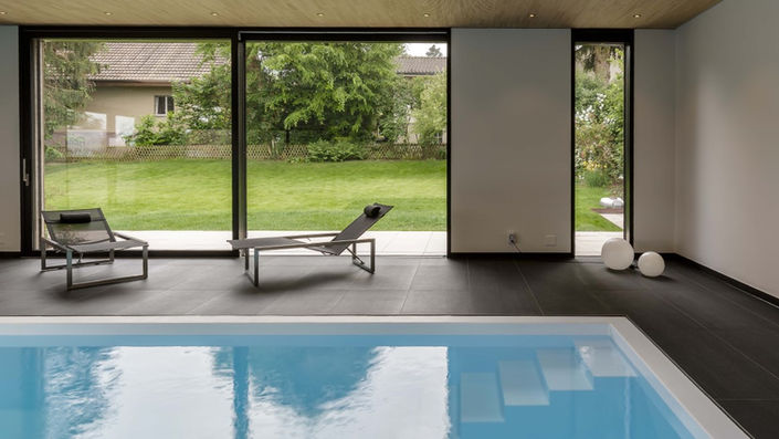 Wir haben den Auftrag erhalten, einen Hallenbadanbau aus den 60er Jahren zu modernisieren. Weil die bestehende Bausubstanz in schlechtem Zustand war, haben wir uns gemeinsam mit der Bauherrschaft dazu entschlossen, bis auf den Betonsockel mit dem integrierten Poolkörper alles abzubrechen und mit einem zeitgemässen Holzbau neu aufzubauen. In die bestehende Poolwanne wurde eine auf Mass gefertigte Kunststoffwanne eingesetzt, wie das ganze Gebäude nun wärmegedämmt. Selbstredend wurde auch die Technik -sowohl für die Halle wie für das Wasser - neu gebaut: Wärmepumpe, Lüftung, Entfeuchter, etc. Die Steuerung der ganzen Anlage erfolgt bequem über ein Tablet. Der Innenraum ist bewusst schlicht gehalten, die Akustikholzdecke und eine Natursteinmauer ergeben zusammen mit dem warmen Plattenboden dennoch eine wohlige Atmosphäre. Die Fassade besteht aus grossformatigen Vollkernplatten. Deren Design nimmt sich zurück, womit sich der Anbau trotz seiner Grösse gut der Umgebung unterordnet.
